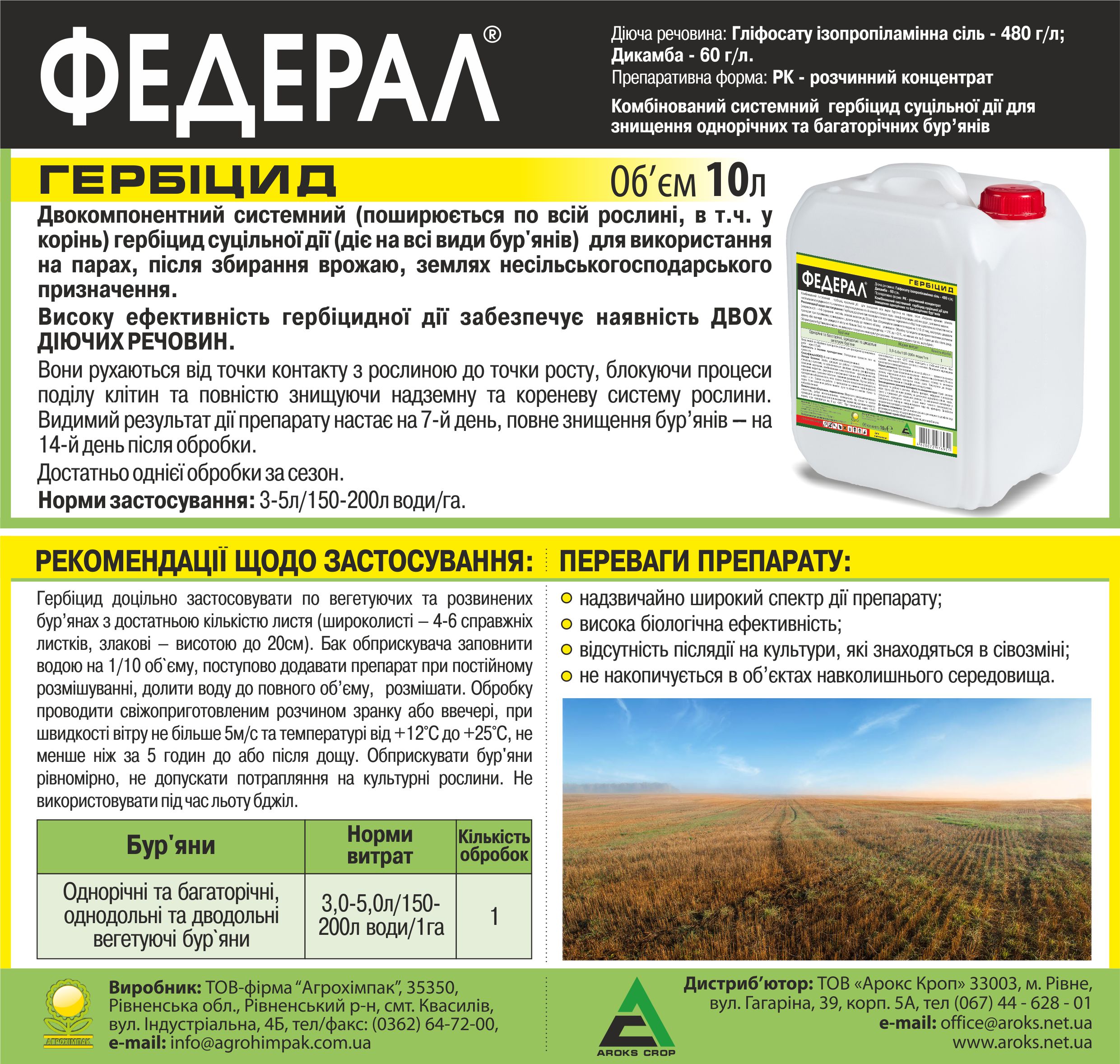 Комбінований ( 2 компоненти ) системний (поширюється по всій рослині, в т.ч. у корінь) гербіцид суцільної дії (діє на всі види бур'янів) для використання на парах, після збирання врожаю, землях несільськогосподарського призначення.