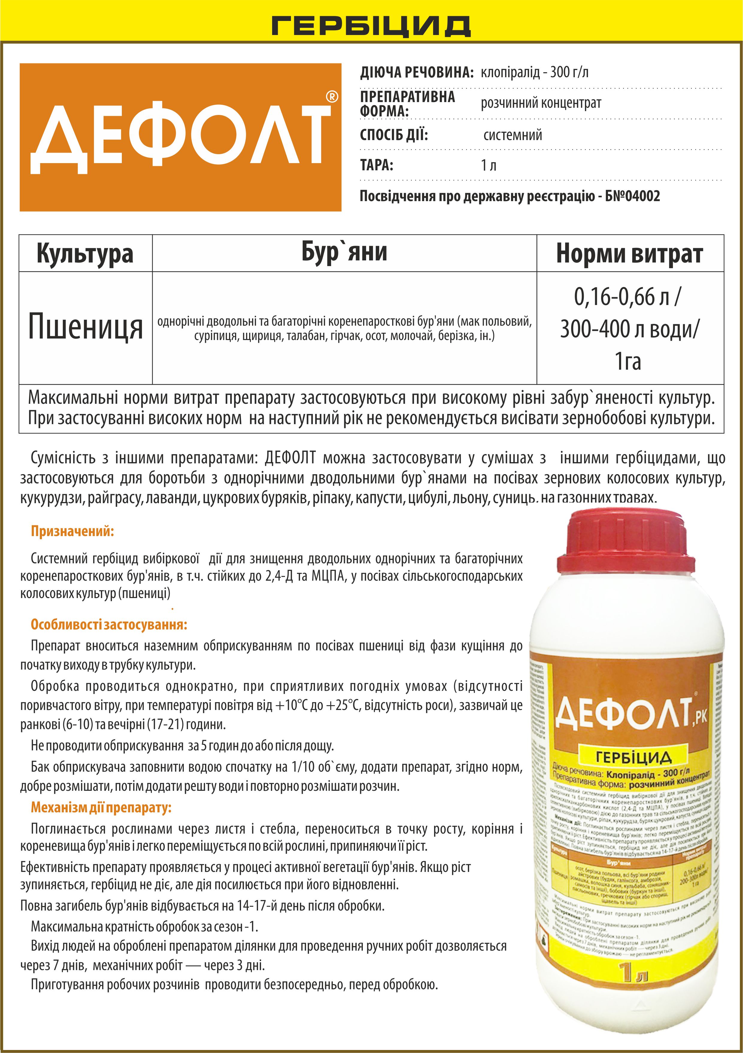 ДЕФОЛТ, РК можно применять в смесях с другими гербицидами, которые применяются для борьбы с однолетними двусемядольными сорняками на посевах пшеницы.