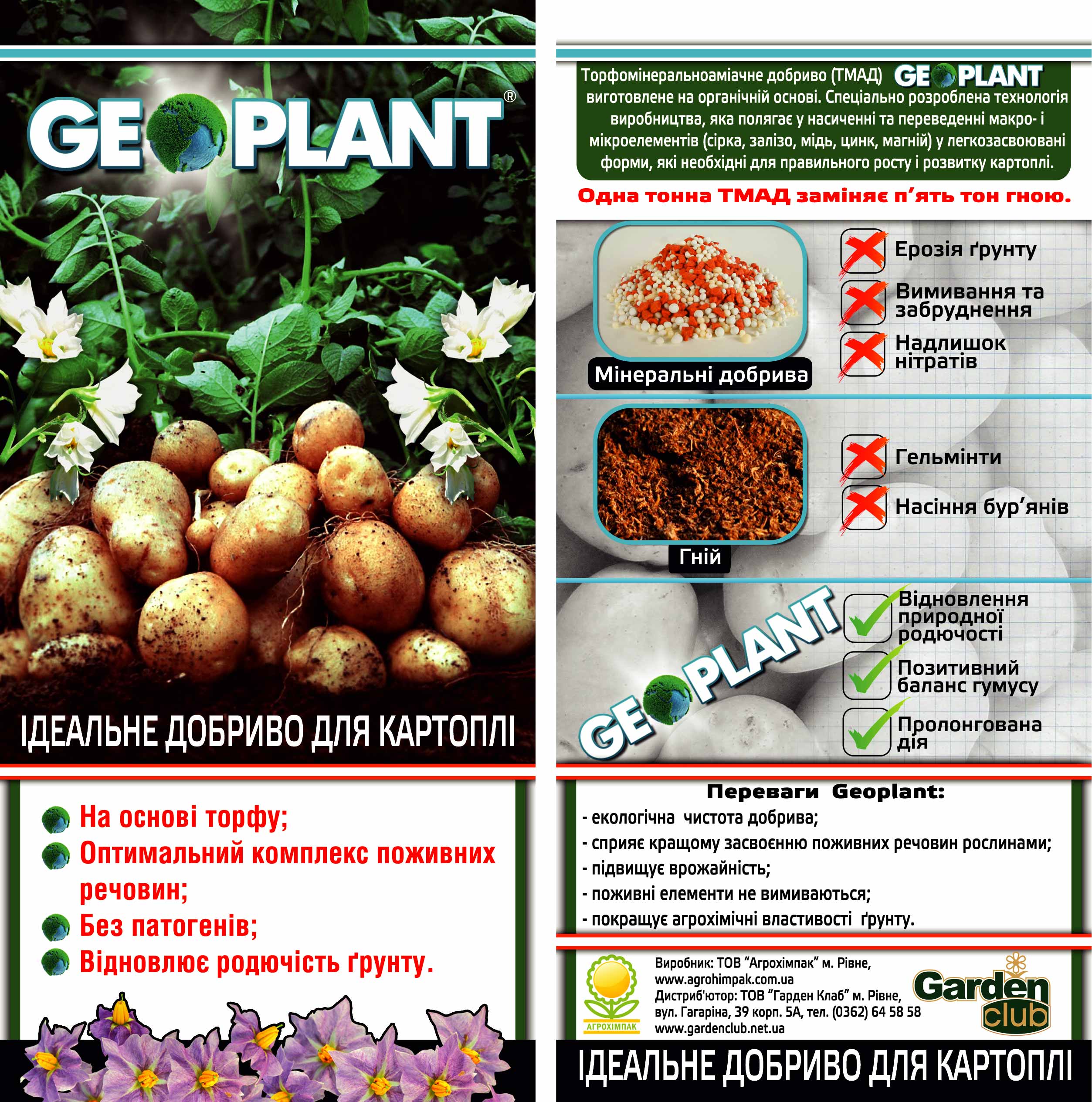 В отличие от навоза, торф характеризуется чистотой, отсутствием болезнетворных бактерий, яиц гельминтов, семян сорняков и техногенных загрязнений, хорошей влаго- и воздухопроницаемостью, высоким содержанием природных гуминовых кислот. Повышенное содержание азота в форме гумата аммония стимулирует лучшее усвоение растениями питательных веществ, что положительно влияет на их развитие, повышает урожайность, плодородие почвы. Одной из функций Geoplant является накопление органического вещества в почве, значительная часть которой превращается в гумусные соединения, что приводит к восстановлению плодородия почв естественным путем.