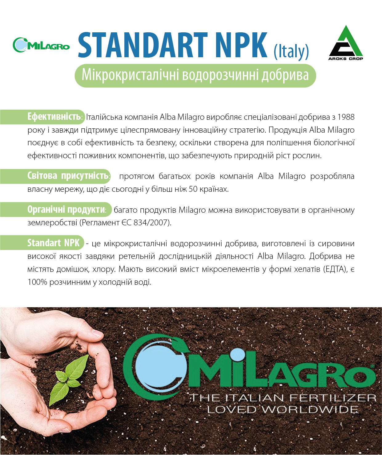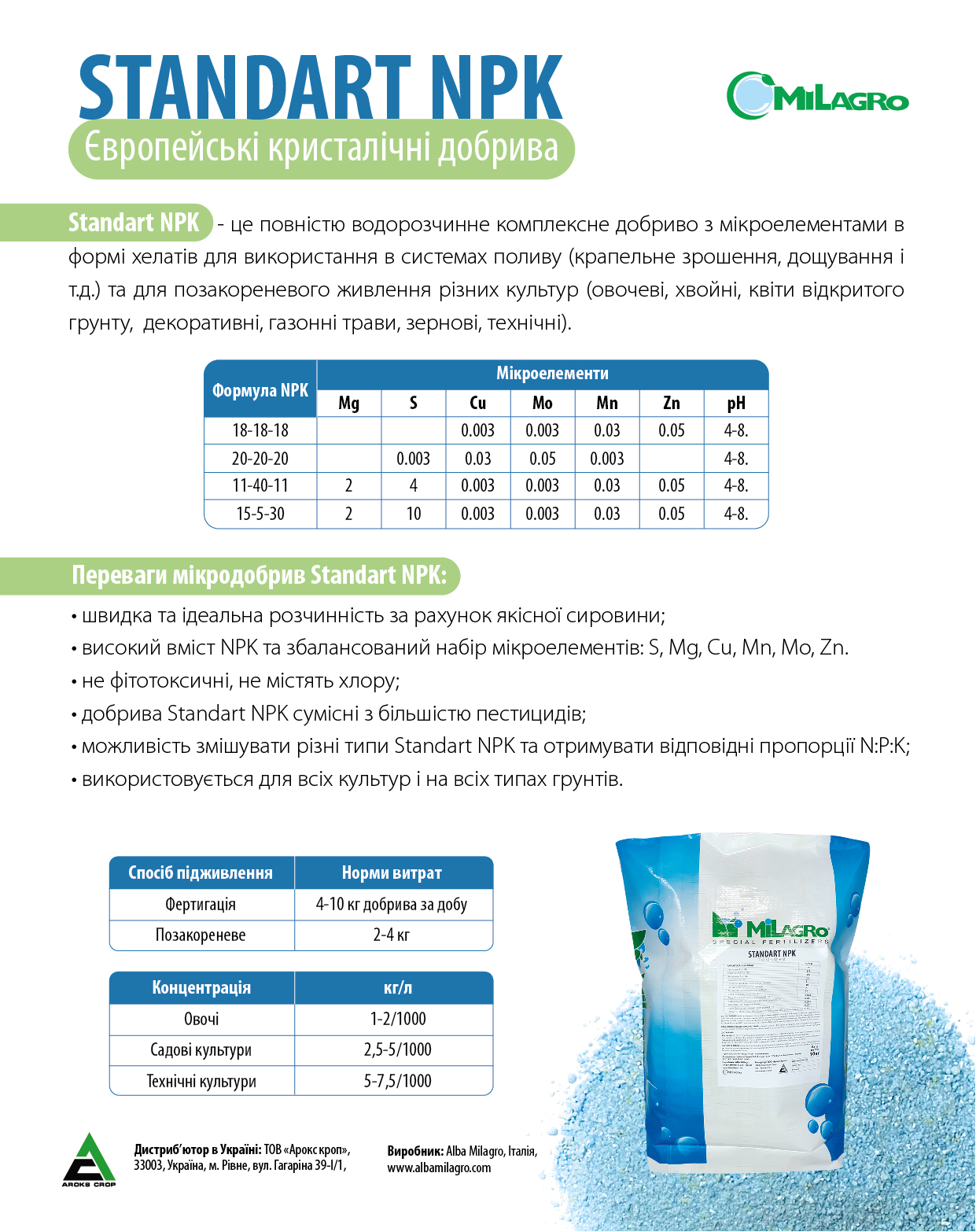 Standart NPK - це повністю водорозчинне комплексне добриво з мікроелементами в формі хелатів для використання в системах поливу (крапельне зрошення, дощування і т.д.) та для позакореневого живлення різних культур (зернові, овочеві, технічні, хвойні, декоративні, квіти відкритого грунту, газонні трави).